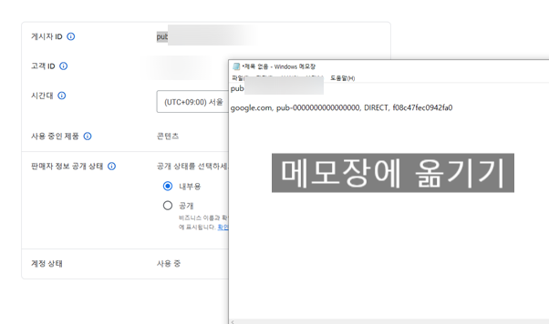 여기 아래 4번에 google.com, pub-00000000000000, DIRECT, f08c47fec0942fa0 복사해서 메모장에 붙여주세요.