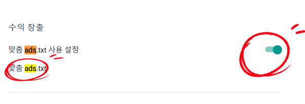 그러면 수익창출 부분에 맞춤 ads.txt 가 나올거예요. 사용설정 누르기소, 아래 눌러보세요!
